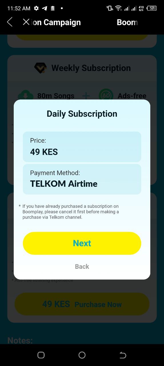 For our trial, we selected the daily subscription at KSh. 49. Click Next, and then enter your phone number and the verification code sent to you via text to verify the purchase and that’s it.